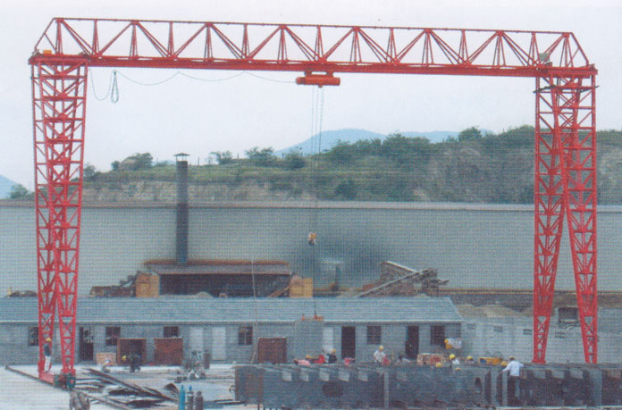 門式起重機(jī)是橋式起重機(jī)的一種變形,又叫龍門吊。主要用于室外的貨場(chǎng)、料場(chǎng)貨、散貨的裝卸作業(yè)。它的金屬結(jié)構(gòu)像門形框架,承載主梁下安裝兩條支腳,可以直接在地面的軌道上行走,主梁兩端可以具有外伸懸臂梁。門式起重機(jī)具有場(chǎng)地利用率高、作業(yè)范圍大、適應(yīng)面廣、通用性強(qiáng)等特點(diǎn),在港口貨場(chǎng)得到廣泛使用。